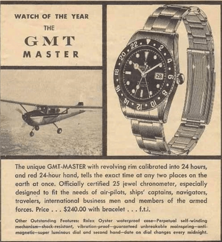 1954 yılında Rolex GMT-Master (ref. 6542) modeli, Pan Am havayolları pilotlarının talebi üzerine geliştirilmiştir. Jet çağının başında, uzun mesafe uçuş yapan pilotlar için farklı zaman dilimlerini kolayca takip edebilmek büyük bir ihtiyaçtı. Rolex’in çözümü, standart saat ibrelerine ek olarak 24 saatlik bir ibre ve çift yönlü döner bir bezel kullanarak bu ihtiyaca cevap vermekti. Bu saat kısa sürede sadece profesyonellerin değil, saat koleksiyoncularının da ilgisini çekti.